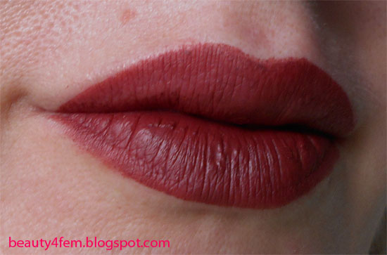 Текстура у нее очень мягкая, наносится удобной кисточкой, приятно лежит на губах. Распределяется хорошо, не выходит за контур губ. Спустя пару минут она начинает застывать…иии мы получаем — матовость, стойкость.