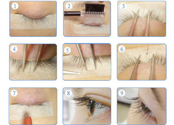 Работу начинают с приклеивания самых коротких искусственных щетинок. При этом волосок прикладывается не сбоку, а строго поверх родной реснички. Во избежание склеивания соседних ресничек не переусердствуйте с количеством наносимого клея.
